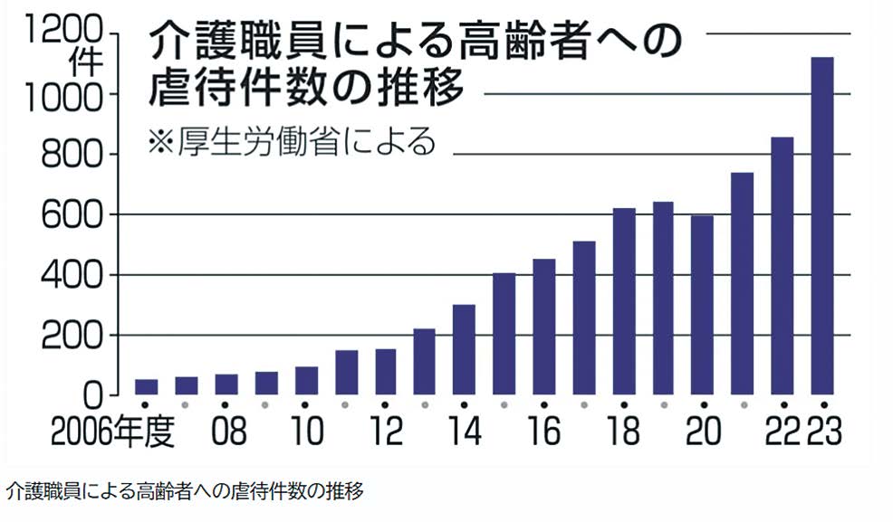 高齢者に対する虐待件数は、家族からのものが圧倒的に多いものの(2023年度の厚労省の統計によると1万7100件)、件数は増加傾向にある。